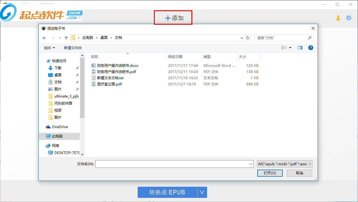 2、我们点击【添加】按钮,在呼出的添加电子书窗口中选择要转换的电子书文件。