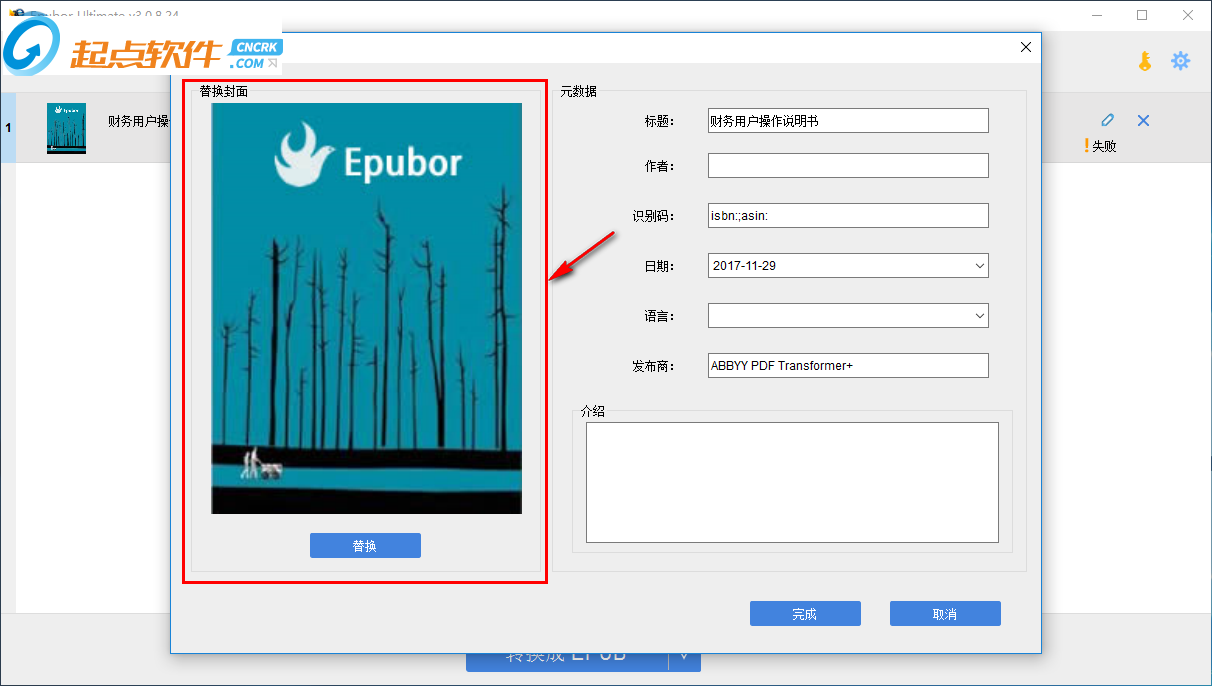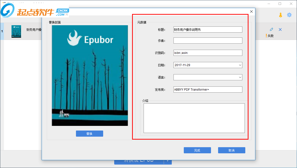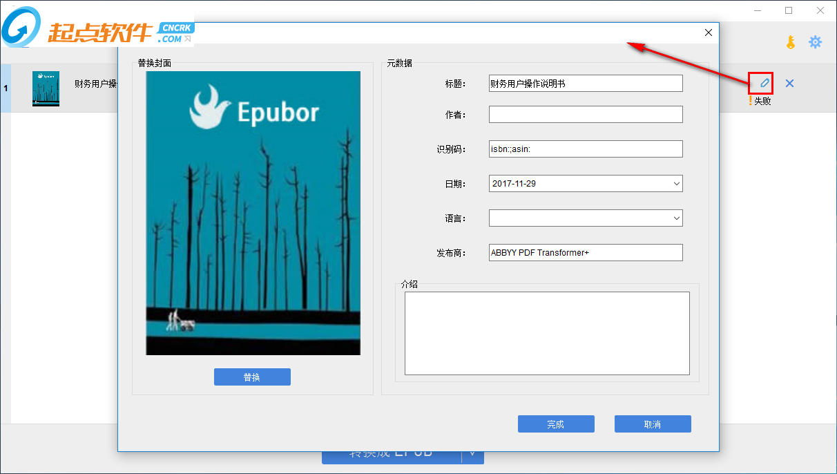 5、在元数据一栏下根据需要对标题、作者、识别码、发布商等信息进行编辑,完成后点击【完成】按钮。