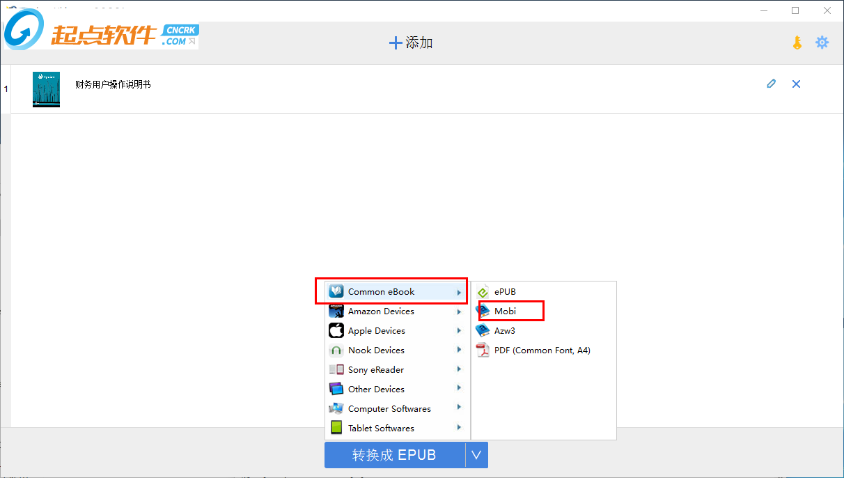 6、我们点击【转换为EBUB】右侧的下拉箭头,然后选择您要转换的设备格式与具体文件格式。