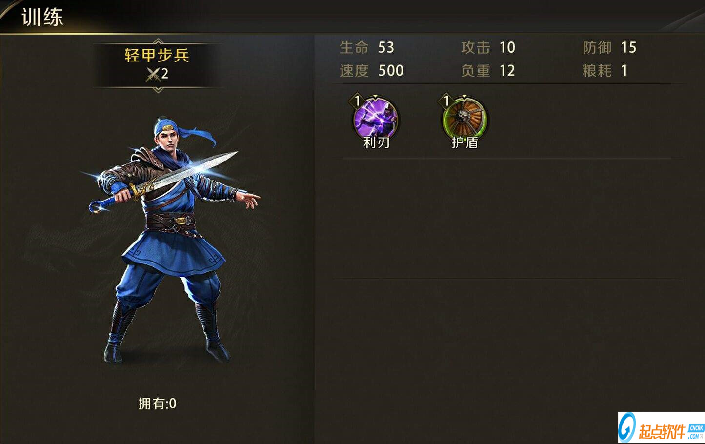 在步兵里面最基础的就是轻甲步兵,通过科技可以解锁铁甲卫、剑盾士、胄盾武士和御林神卫。步兵的技能主要有两个,利刃(擅长斩杀缺乏防护部队,对弓兵有额外的伤害)和护盾(有效防御箭矢的伤害,减轻受到弓箭手的伤害)。