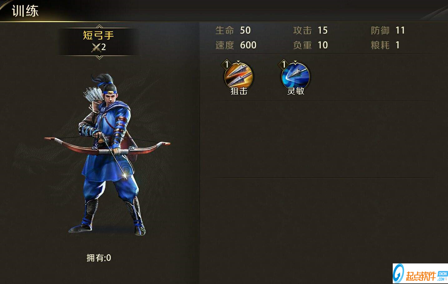 弓兵兵种里最基础是短弓手,通过科技可以解锁羽弓手、猎弓手、精锐神箭、御林射手。弓兵的技能是阻击,更容易瞄准体型庞大的骑兵,对骑兵造成额外的伤害;另外还有灵敏技能,可以灵巧的避开骑兵的攻击,受到骑兵的伤害减少。