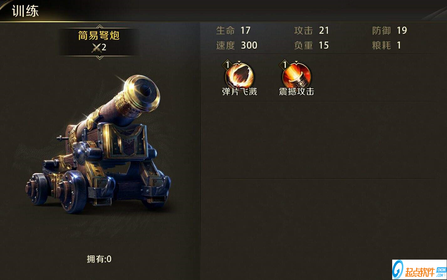 车兵兵种里最基础的是简易弩炮,随着科技可以解锁虎头炮、玄武弩炮、朱雀火炮、真龙井栏。而车兵的技能是弹片飞溅和震撼攻击,弹片飞溅是车兵的攻击会炸裂开,会对附近最多3个单位造成伤害,震撼攻击则是对城墙和陷阱造成额外的伤害。
