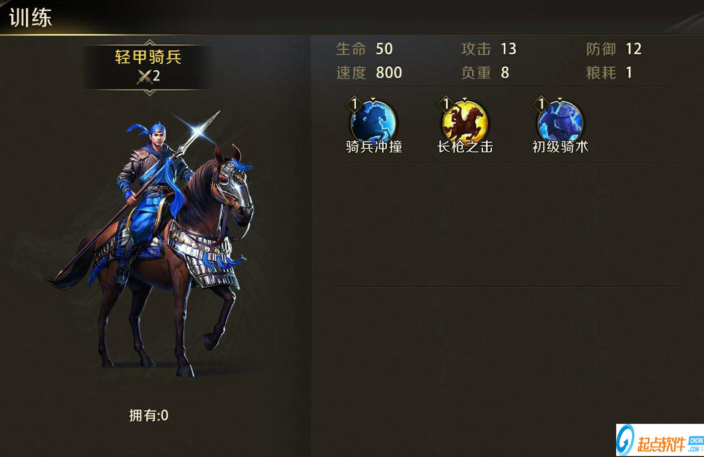 骑兵兵种里最基础的是轻甲骑兵,随着科技可以解锁宿卫虎骑、长枪义从、精锐铁骑、传奇象兵。骑兵的技能比其他兵种还多一个,分别是骑兵冲撞、长枪之击和初级骑士。骑兵冲锋是当骑兵在一定距离外冲锋到敌人的时候,会对敌人造成一次冲锋伤害;长枪之击是骑兵可以居高临下攻击近战单位,对步兵造成额外伤害;初级骑术是骑兵的速度使步兵很难对他造成威胁,受到步兵的伤害减少。