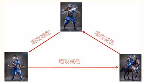 兵种分为步兵、弓兵、骑兵和车兵四个兵种,优先受到伤害的是步兵,依次为骑兵、弓兵、车兵。其中步兵、骑兵、弓兵、存在相互克制的关系,几个兵种属性不一。