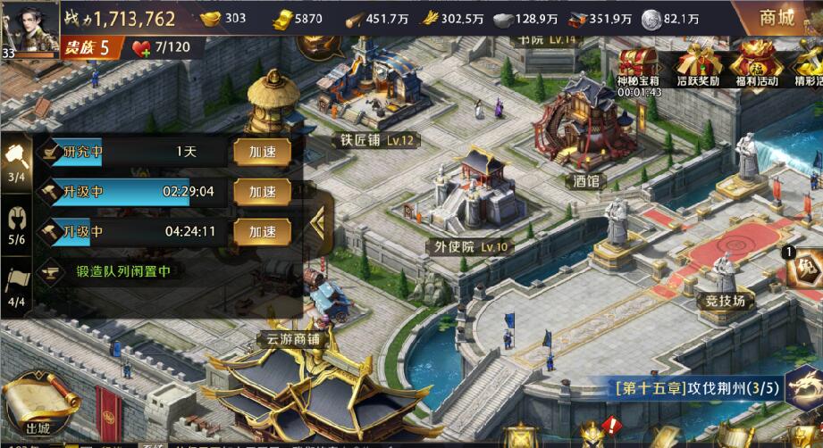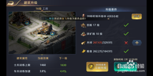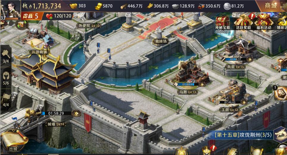 建筑升级提升,建筑升级提升的战力跟武将提升差不多,不是很高,着重提升城堡,城墙,校场,都督府,外史院,资源田提升其中一个就可以,达到城堡升级要求即可。