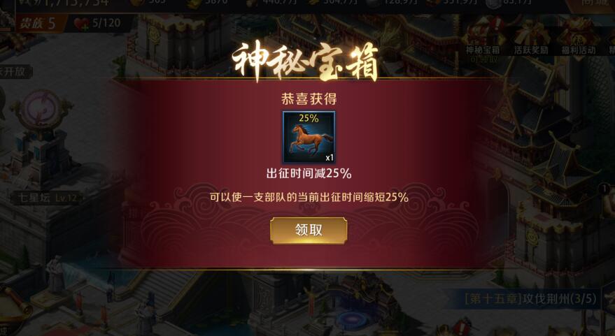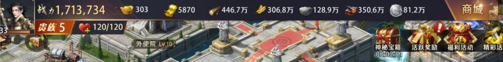 在商城下面有四个图标,神秘宝箱其实是在线福利,会有倒计时提示。倒计时结束后,方可打开宝箱。打开时间越来越长,奖励也越来越好。当然只是基础一些的福利,不会有太稀有的宝物,不过积少成多。主公不要忘记领取哦~。第二个是活跃奖励。点开可以看到日常任务列表,快速清任务必备。第三个是福利活动,有超值返利、每日特惠、成长基金、累充礼包等,都是非常不错的活动。建议买成长基金,价格亲民,随着宫殿等级的升高返还大量金券,助主公成就霸业。最后一个就是精彩活动啦,当主动达到一定成就或者完成一些活动可以领取奖励时,图标上都会出现一个红色的感叹号,提醒主公领取福利,是不是很人性化呢?