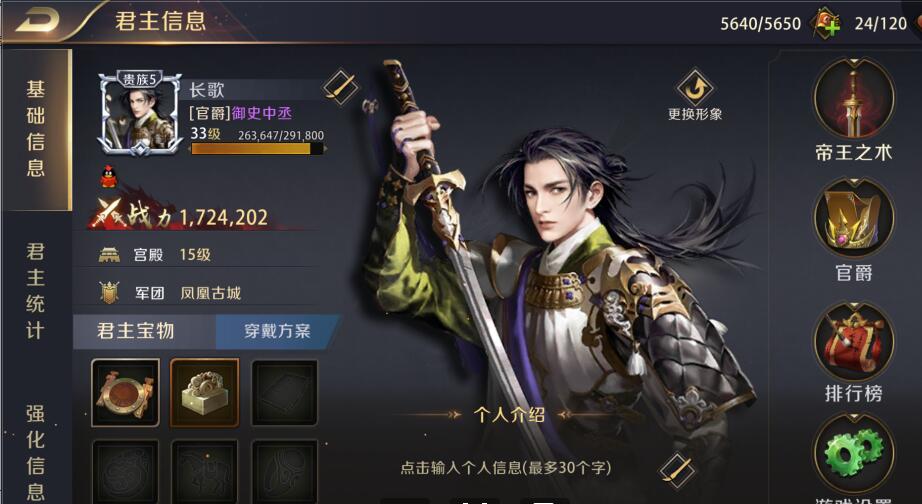 点击主公头像可以调出主公个人信息一览表。在这里可以查看基础信息、君主统计、强化信息,还可以选择帝王之术加点,查看官爵和对应任务。查看排行榜以及打开游戏设置。