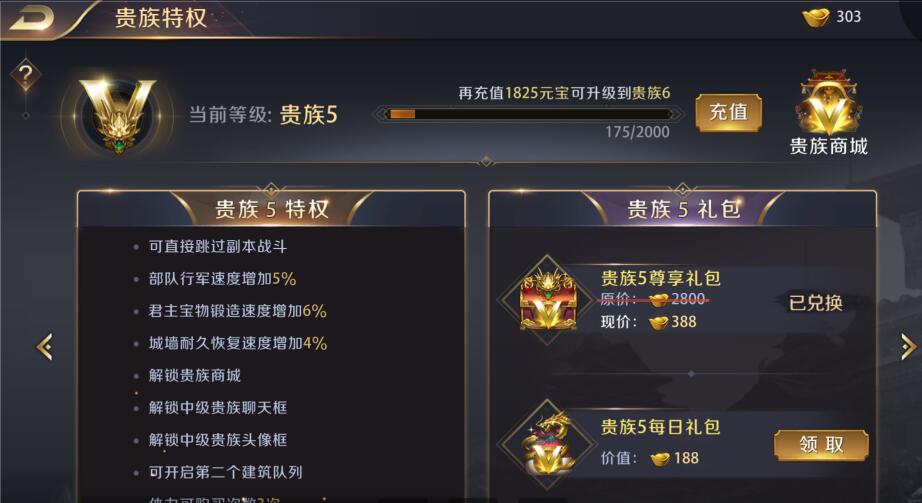 点击贵族选项可以直接跳转贵族特权界面。特权等级会在主界面直接显示,而具体数量会在本界面显示,主公可以点击贵族商城购买所需道具,同时贵族礼包也在这里领取,主公不要忘记啦。
