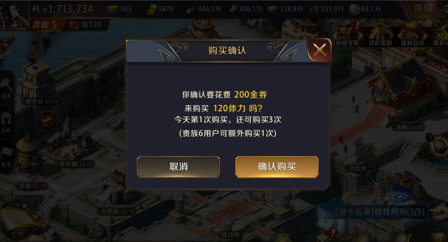 游戏里的货币有元宝和金券2种,这两种货币的用途和获得方法均不同。其中,金券的用处有很多,可购买资源升级建筑、购买一些加速道具、购买行动力、加速士兵的训练和建筑的建造速度等。金券可以通过元宝来兑换、通过每日俸禄来获得、通过参加各种活动来获取金券。