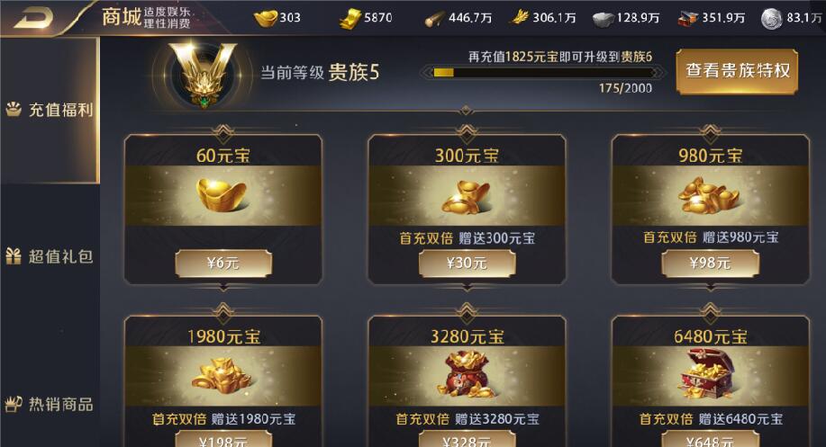 游戏中元宝最重要的一个获取元宝的方式就是充值了,大家可以在商城里面购买到各种各样的游戏礼包,以及直接购买元宝。元宝的作用非常大,玩家可消耗元宝来对金券,而还能使用元宝,来购买商城里的礼包、热销商品等道具物品。