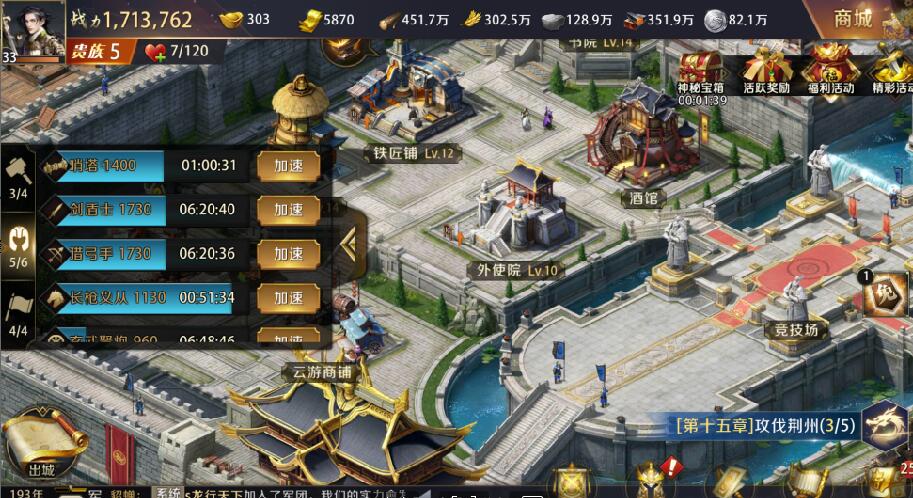 士兵训练是战力提升的主要方式,书院科技出4级紫兵的时候,就开始爆兵,各种加速和金币,能出多少出多少。战力可迅速提升。