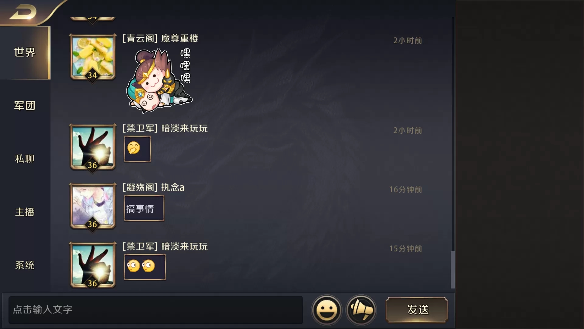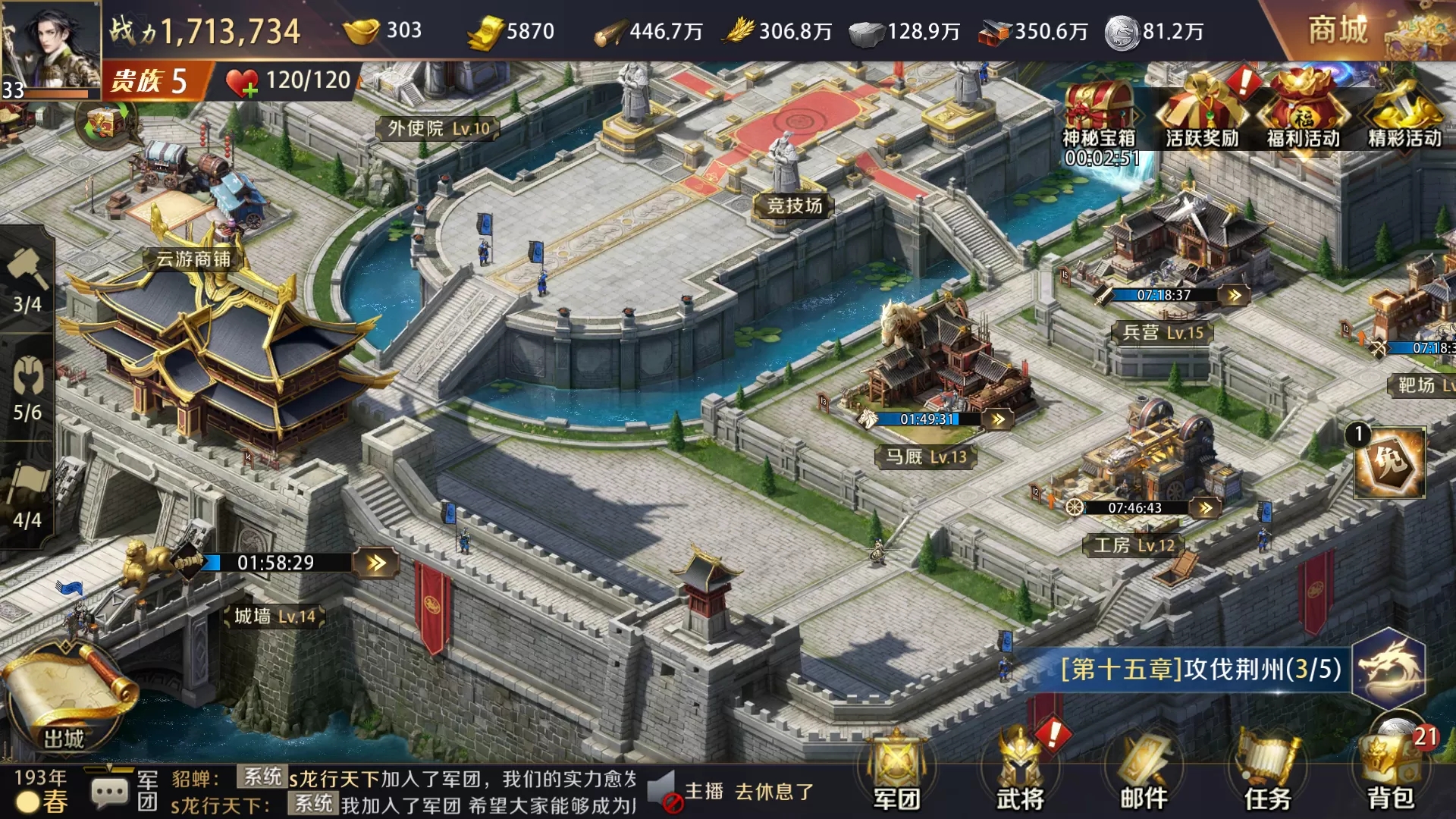 那么城外的图标就介绍到这里,让我们再次点击左下角的图标回到主城。在主界面最下方有时间和时令的显示,春夏秋冬会交替出现和现世的季节不同步,主公可以在一天之内看到四季的景象,非常神奇。右边是对话框,包括世界频道、军团频道、私聊、主播动态、系统提示都可以看到。