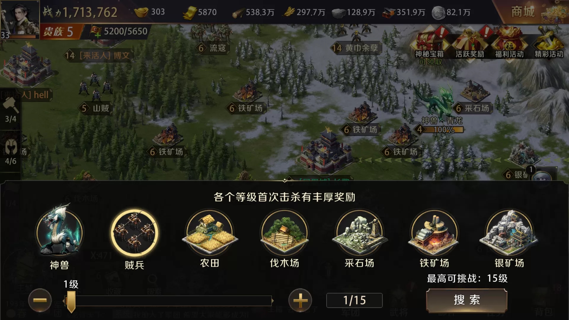 在城外地图上,资源都标注着文字,主公可以派遣军队采集资源。点击左下角搜索按钮可以搜索任何主公想要的资源:农田、伐木场、采石场、铁矿场、银矿场;并且可以选择资源的等级,当然由于地理位置的原因,有些等级的资源在主公附近是无法找到的,等级越高的资源越丰富。同时地图上还有神兽和不定期刷新的贼兵,搜索按钮都可以搜索,也可以在大地图上看到后直接攻击。