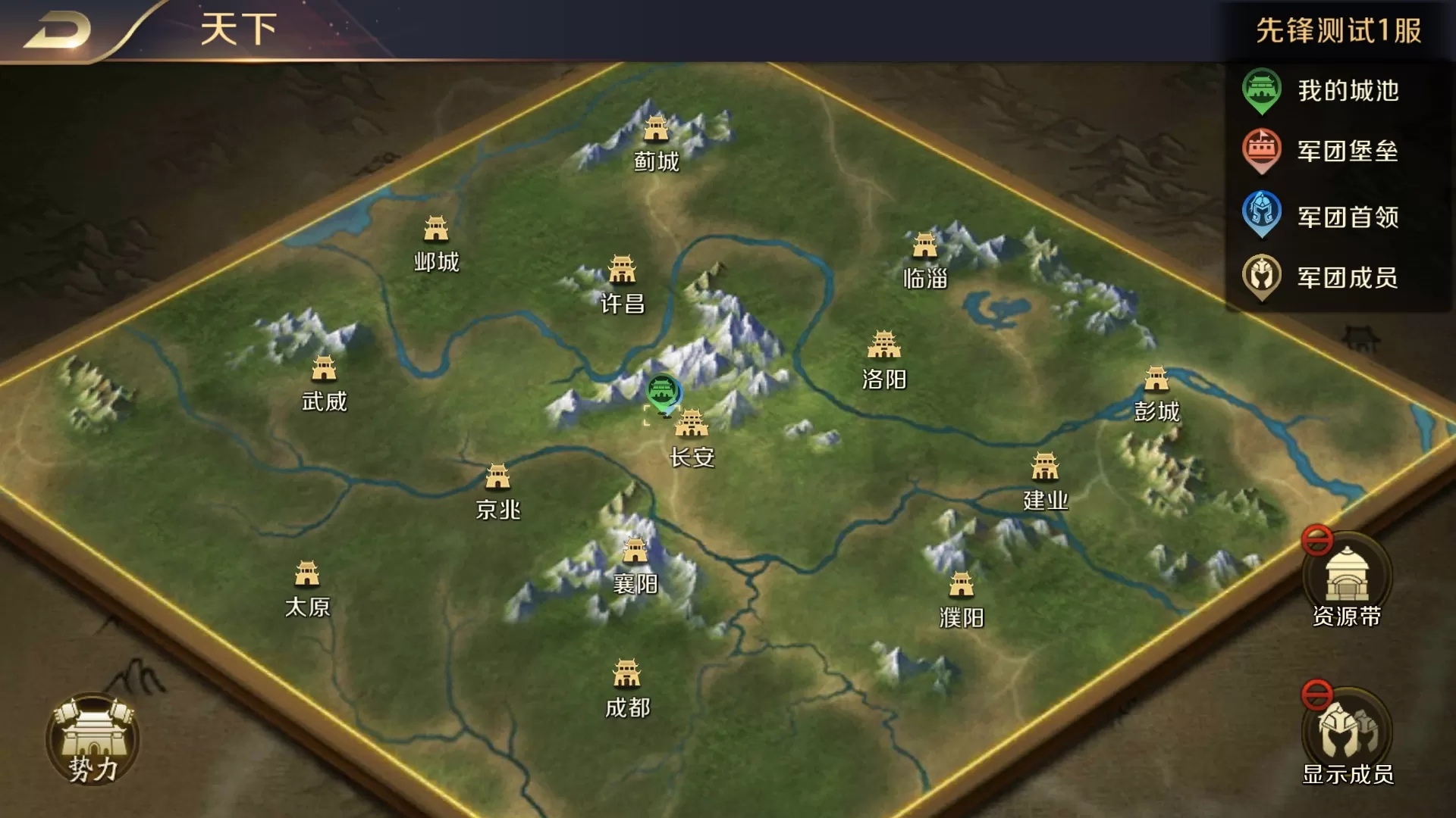 在世界地图中,绿色的是“我的城池”的位置,红色的是军团堡垒的位置,这时候点下,红色的军团位置。进入军团地图。