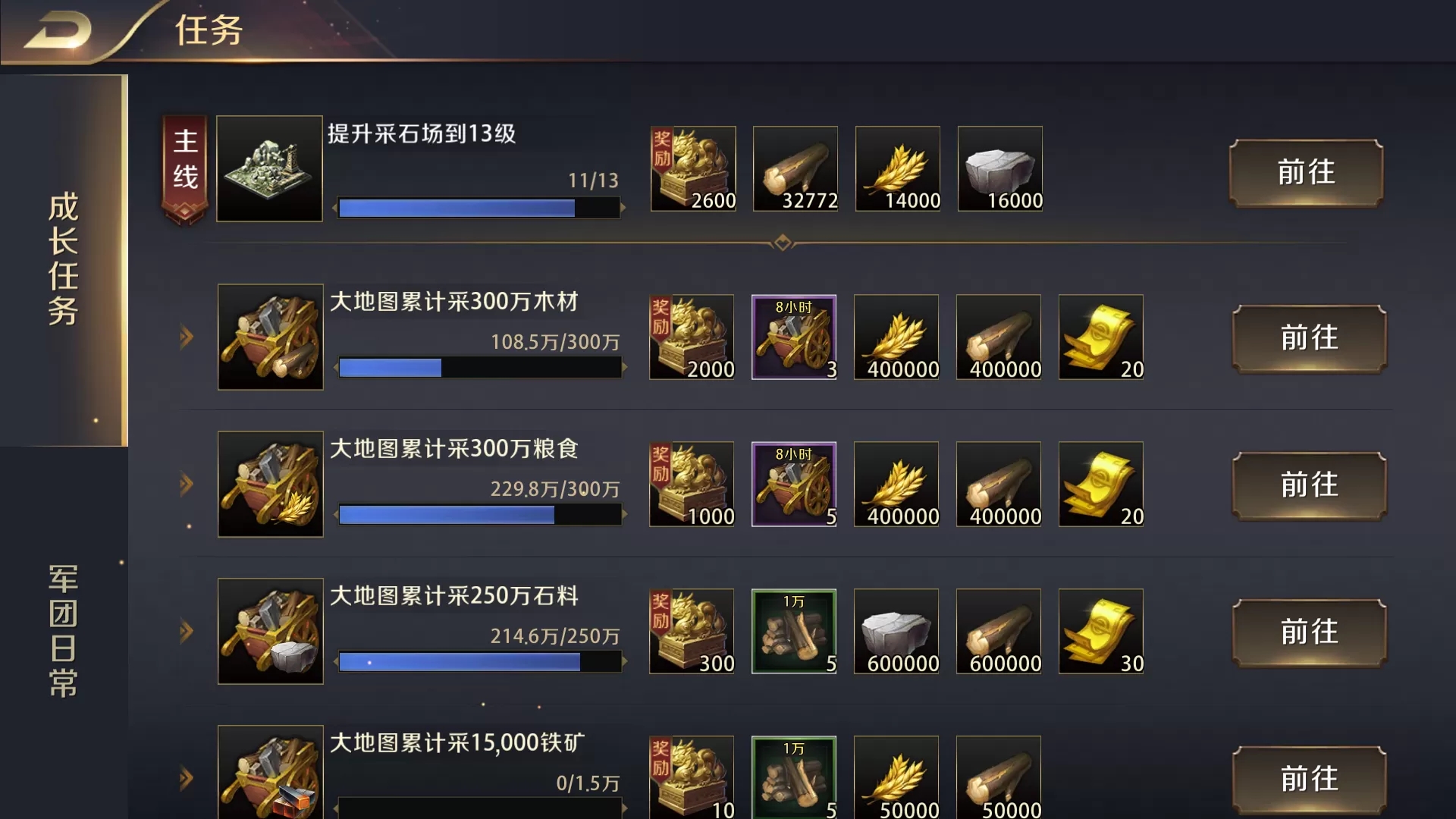 邮件图标则可以打开邮件。系统提示、活动赠礼、收集资源成功提示等都会出现在这里,主公记得及时打开消息以免错过重要情报哦~倒数第二个任务图标,主线任务和支线任务都在这里,主线任务包括“成就霸业”任务。即主公可通过此任务晋升官爵;支线任务大都是成就任务——达到某些条件就可以领取。任务完成时在任务图标上会出现数字,数字为多少就说明主公完成的任务有几个,可以点开领取,完成任务可获得大量资源和经验,助主公快速提升实力。