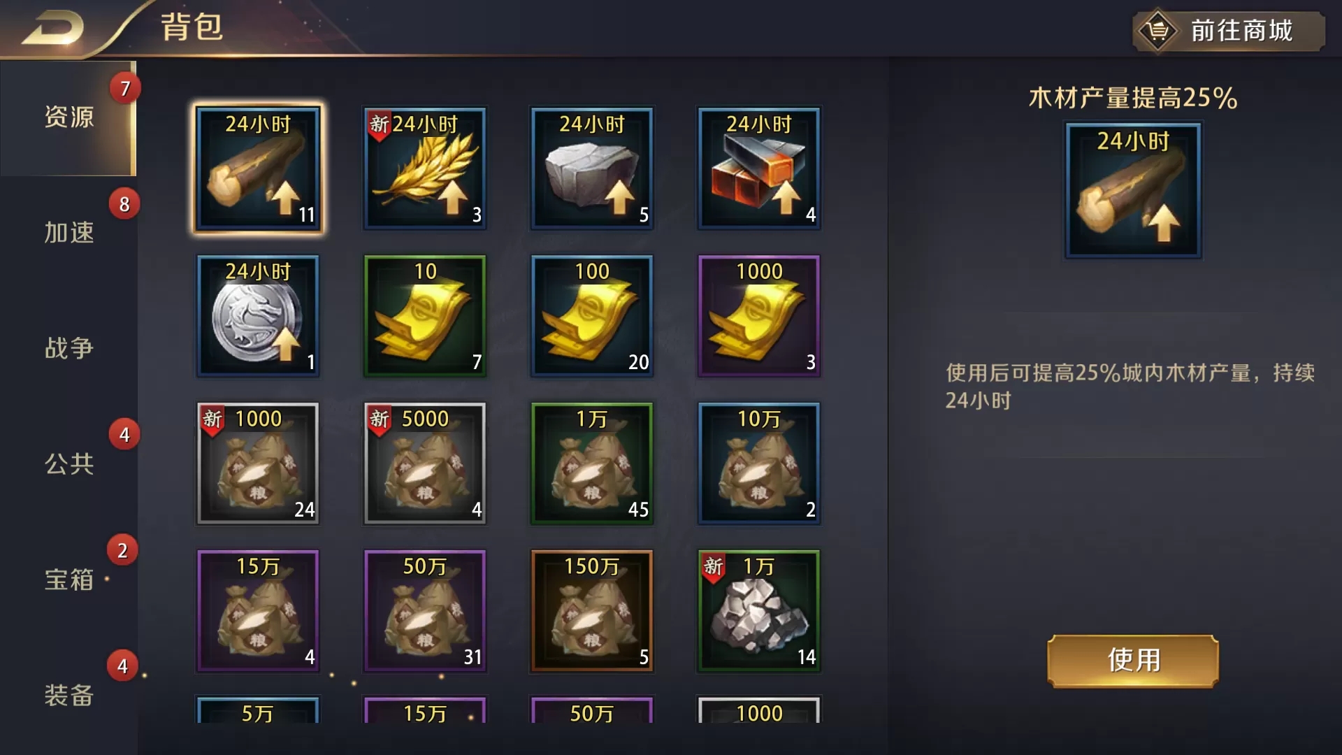 游戏的消耗品主要有粮食、石料、银币、水晶、加速道具、免战令、宝箱等道具,这些消耗品使用后,可增加角色一些安全的粮食、石料、水晶等资源,或者能帮助加速建筑的建造时间等。这些消耗品可在背包里叠加,玩家消耗掉这些消耗品后,背包里的叠加数量会减少。玩家要想获得各种消耗品,可通过神秘宝箱、活跃奖励、特惠福利、每日礼包、签到礼包等途径获得。