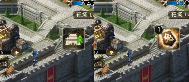 第二个头盔标志是主公的军队建设进度显示,包括各兵种的训练、城墙军械的建造、哨塔的建设等。