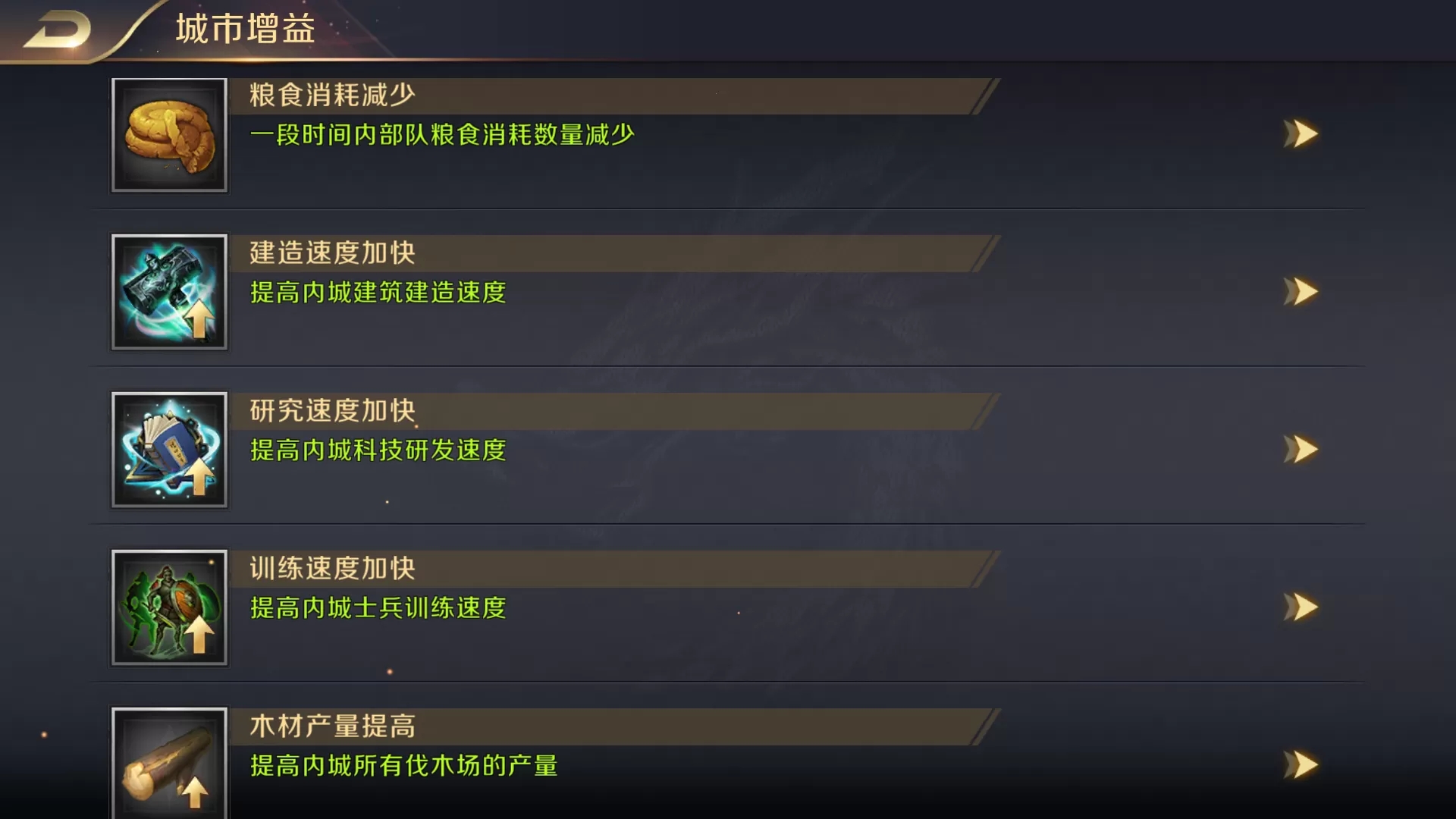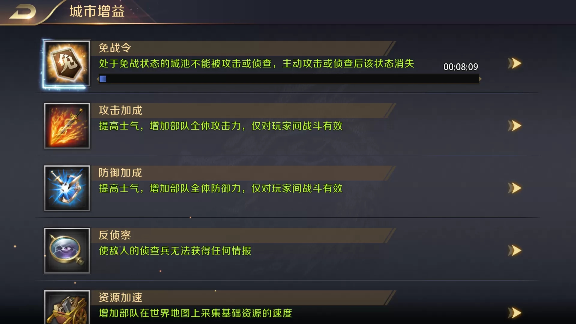 主公可以直接点击这里,决定要使用的增益。功能非常全面,有免战、反侦察、攻击加成、防御加成、资源加速、粮食消耗减少、建设速度增加、资源产量提高等,主公可以根据自己的需要选择对应的增益。