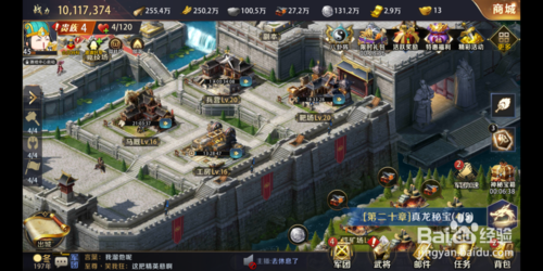 中间显示的是主公的资源储备,从左到右分别是:元宝、金券、木材、粮食、石料、铁矿、银币的数量。在《真龙霸业》中,资源是发展的基础条件。无论是军队出征、防御敌军、攻打副本还是建设城池等方面,都需要大量资源的支持。所谓经济基础决定上层建筑,资源越多主公的权利与地位也越高。最右端是游戏商城图标,点击即可直接进入,主公可以在这里购买需要的道具和充值元宝。