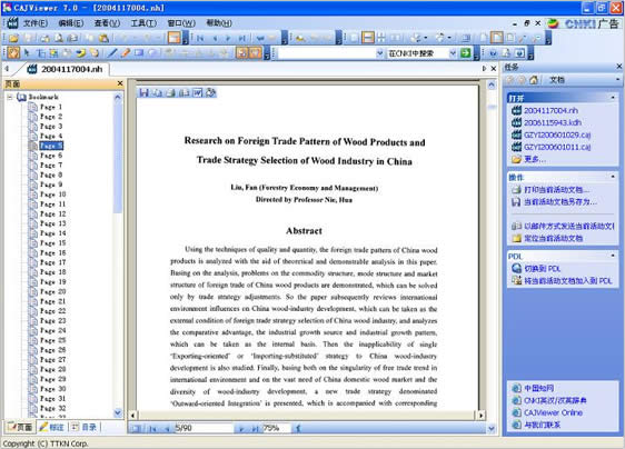 您可以通过菜单"文件"-"打开"来打开一个文档,开始浏览或者说是阅读该文档,这个文档必须是以下后缀名的文件类型CAJ、PDF、KDH、NH、CAA、TEB。打开指定文档后将出现如下界面: