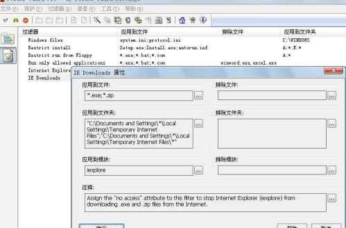 接下来,就是过滤列表,这个说实话我也不是很明白,点开其中一个说下什么意思吧。“应用到文件”即生效的文件,“应用到文件夹”即生效的文件夹,“应用到模块”,即生效的程序。应该是排除误报的作用。