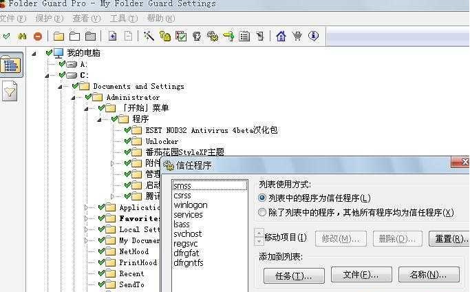 还有“信任程序”,个人没有对这个功能进行配置,使用也很简单,点击“任务”出现当前程序列表,添加就可以了,也可以点击“浏览”找到程序文件。应该是访问权限的白名单吧。