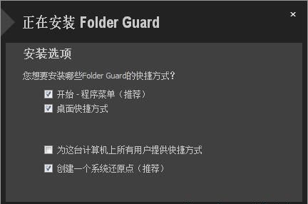 接下来我们要选择安装FolderGuard时候的创建的快捷方式。我们可以选择创建开始菜单快捷方式、桌面快捷方式和创建一个还原点。选择好之后点击下一步继续安装进程;