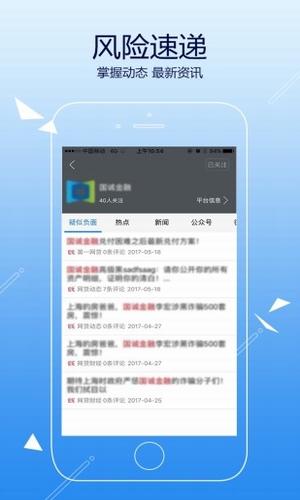 二是企业风险速递功能。APP目前已收录了近2万家互金平台,实时展示更新每家平台的新闻、微信微博等通道信息,并提取其疑似负面信息。