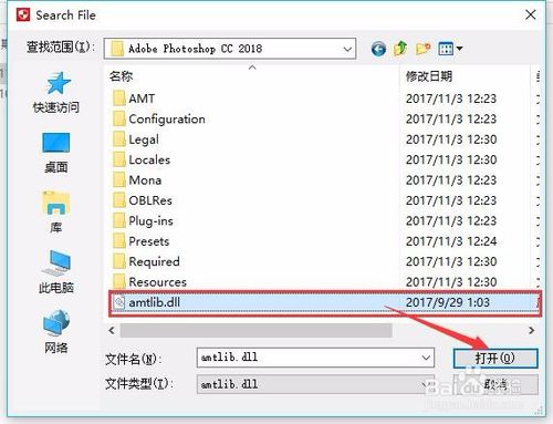 打开C:\Program Files\Adobe\Adobe PhotoshopCC 2018文件夹,选择软件根目录下的amtlib.dll,点击打开。