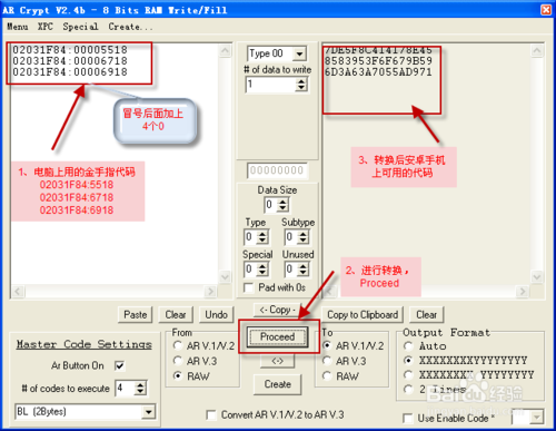 下好工具后打开,在左边的栏里把要转换改写好的代码写进去,在from一栏里,选择RAW,在to一栏里选择AR v.3,然后点Create键,转换好的gameshark码就出现在右边栏里了。