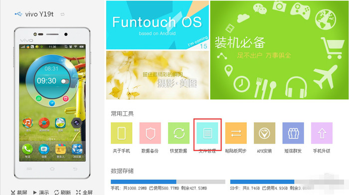 手机的状态一目了然:内存的使用情况,联系人数量、图片数量、短信息数量、应用数量等清晰可见,还可以截取手机的屏幕。