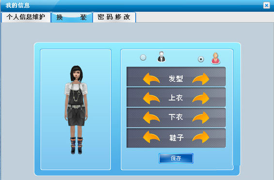 角色:进入角色设置功能,可以设置个人基础信息、人物换装、修改密码等。