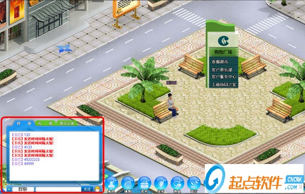C)屏幕左下方为聊天窗口,提供群聊和私聊两种模式,用户可以和场景中的其他用户进行文本聊天。
