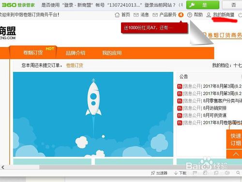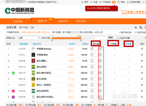 新商盟网上订烟系统怎样订烟首先在新商盟网上订烟系统上用自己的账号和密码登陆并进入订烟页面,如图所示。