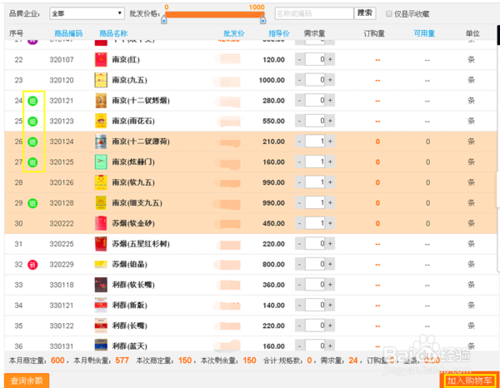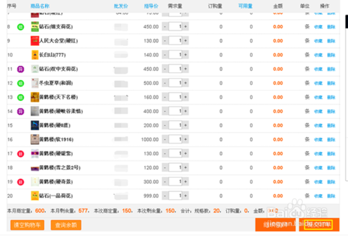 开始订烟。现在一起是187个品种,我们按自己的需求量来订购,当然有些也是没货的,只能在有货的品牌上输入数字,你可以在表上看到三个量,一个是需求量,订购量,可用量,按照这个数据来订购,如图所示。