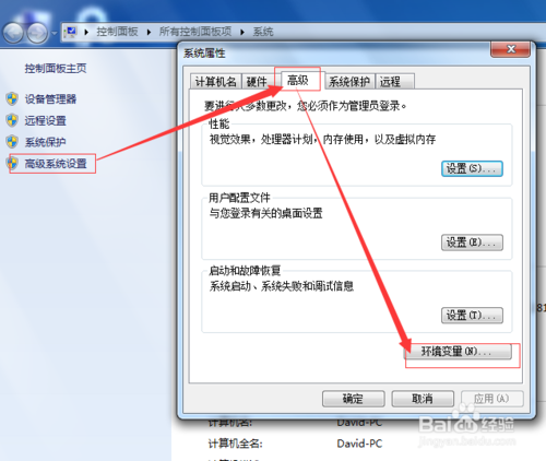 选择“高级系统设置”,系统属性对话框中,选择“高级”选项卡,点击“环境变量”,如下图所示:
