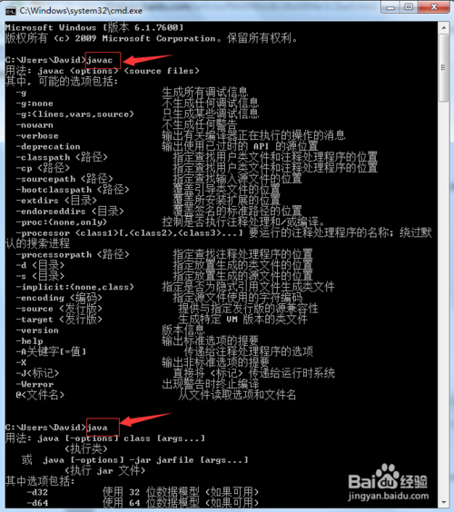 以上配置完成以后,每个弹出框点击确定返回,打开命令行,输入java或者javac,可以看到帮助信息,说明安装成功,如下图所示