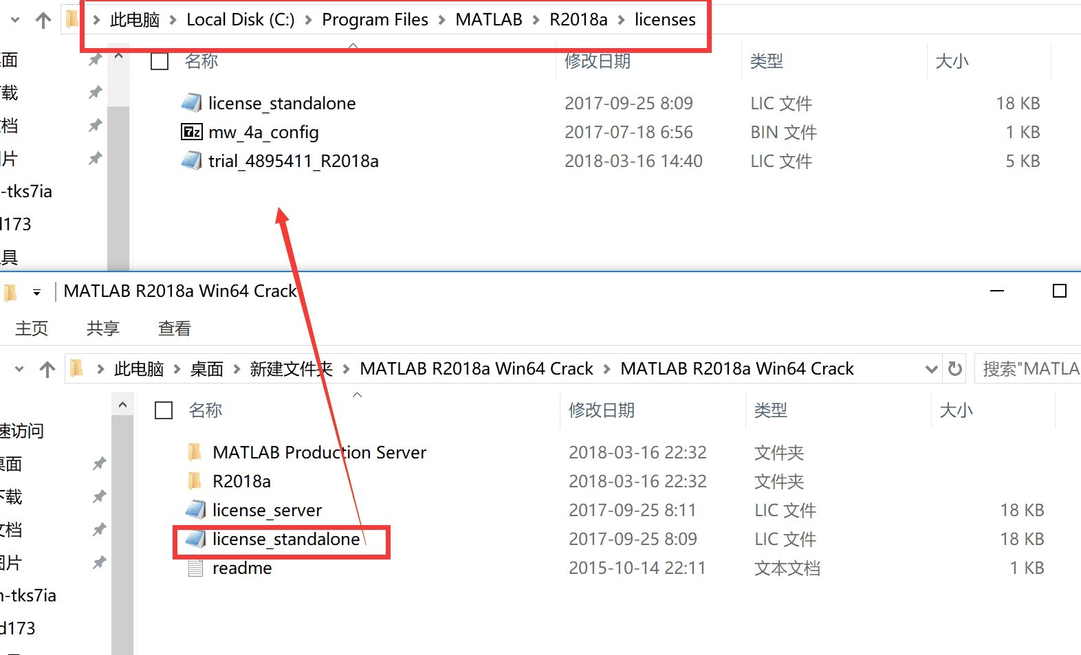 12.先不要运行软件,我们将MATLAB R2018a Win64 Crack文件夹内的license_standalone.lic文件复制到安装目录license目录里面,默认在"C:\Program Files\MATLAB\R2018a\licenses"