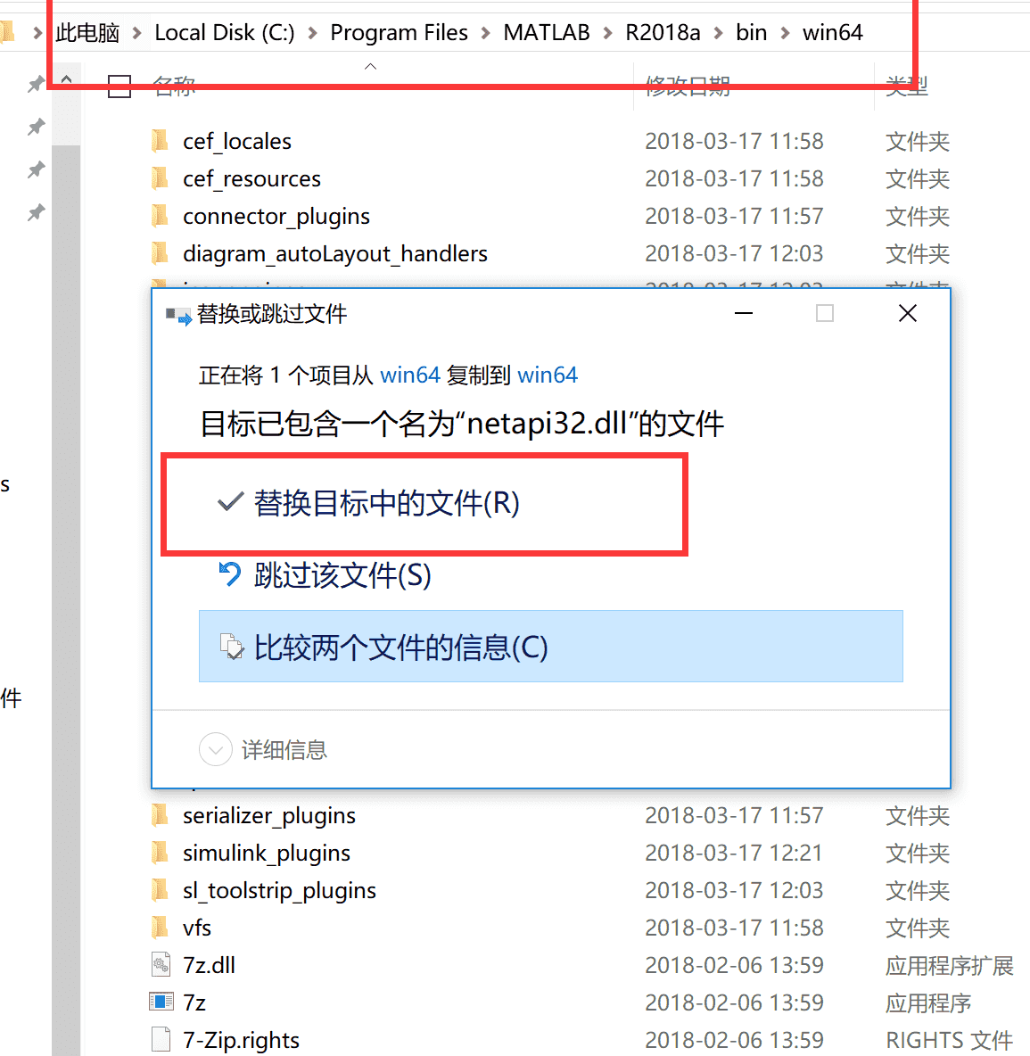 13.继续将MATLAB R2018a Win64 Crack内R2018a文件夹复制到安装目录下,并选择netapi32.dll文件替换覆盖