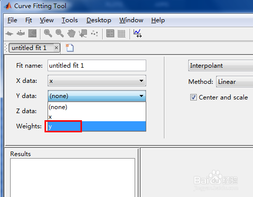 3、在这个拟合工具窗口的左边,选择变量,即分别选择x,y。