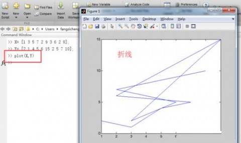 1、在命令窗口,编写离散点向量,例如离散点(X,Y),X=[1357293628],Y=[214561525710],如果我们直接采用Plot作图,画出来的是折线。