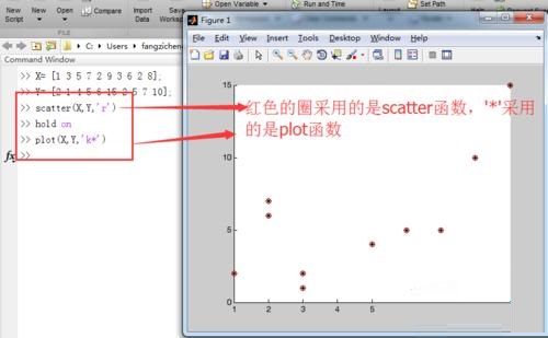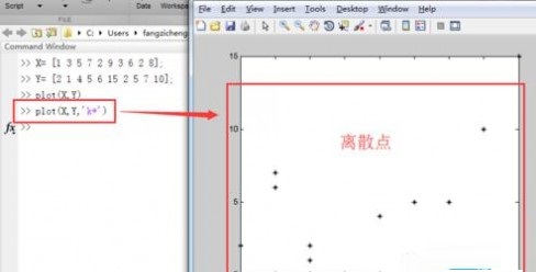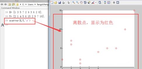 2、重新在命令行输入离散点,采用函数scatter进行画离散点,如:scatter(X,Y,'r'),'r'表示离散点显示为红色。