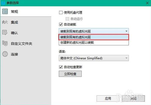 点击设置按钮:自动装载-装载到现有的虚拟光驱,这样设置的好处是,定好了盘符,每次打开新的镜像文件都是同一个盘符,否则前一个没有弹出,再装载时,会新创建一个盘符,这样会显得资源管理器非常的混乱。