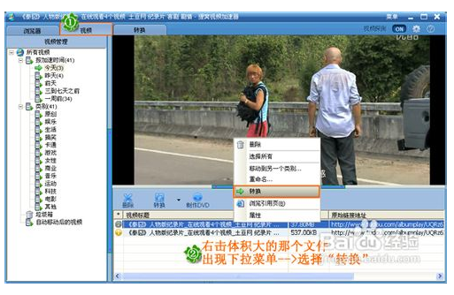 4、缓存好后,我们选择“视频”一项。如下图。在列表区上,有时有好几个文件,那是体积小的一般是视频前后插放的广告,所以我们可以删除掉,你选择目标视频(可播放预览),然后右击文件,再选择转换;