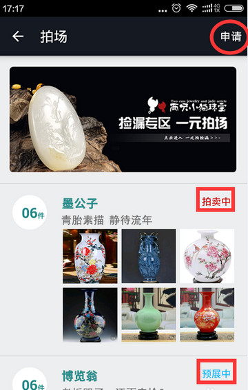 点击“申请”,申请自己的专场拍卖,“拍卖中”是正在拍卖的专场,“预展中”是正在排队等待拍卖的专场