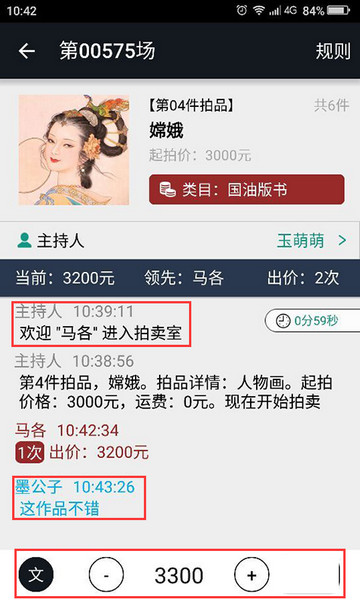 进入拍卖场后,主持人欢迎进场买家,下方菜单栏可以出价、发言