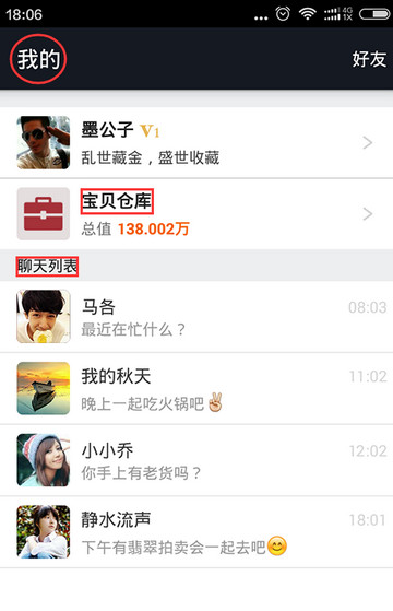 进入我的,可以看到个人资料编辑栏,“宝贝仓库”是每个人添加宝贝的地方,添加足够宝贝后,就可以在拍场、集市一键发布自己的专场拍卖,还可以和好友聊天交友。