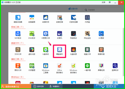 第二步:启动软媒魔方,点击【应用大全】,在应用大全中找到【硬盘装机】,并左键双击【硬盘装机】;