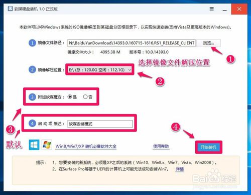 在打开的软媒装机窗口,?点击浏览,找到下载的Windows10系统的ISO镜像文件,点击引入到【镜像文件路径】栏;?选择镜像文件解压路径位置(非系统盘);?默认:【附加软媒魔方】和【启动项描述】;?点击【开始装机】。