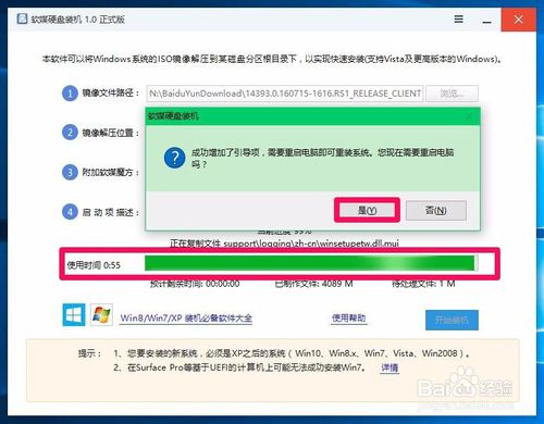 文件复制完成,已成功增加了引导项,需要重启电脑安装系统,点击:是(Y),重新启动电脑;